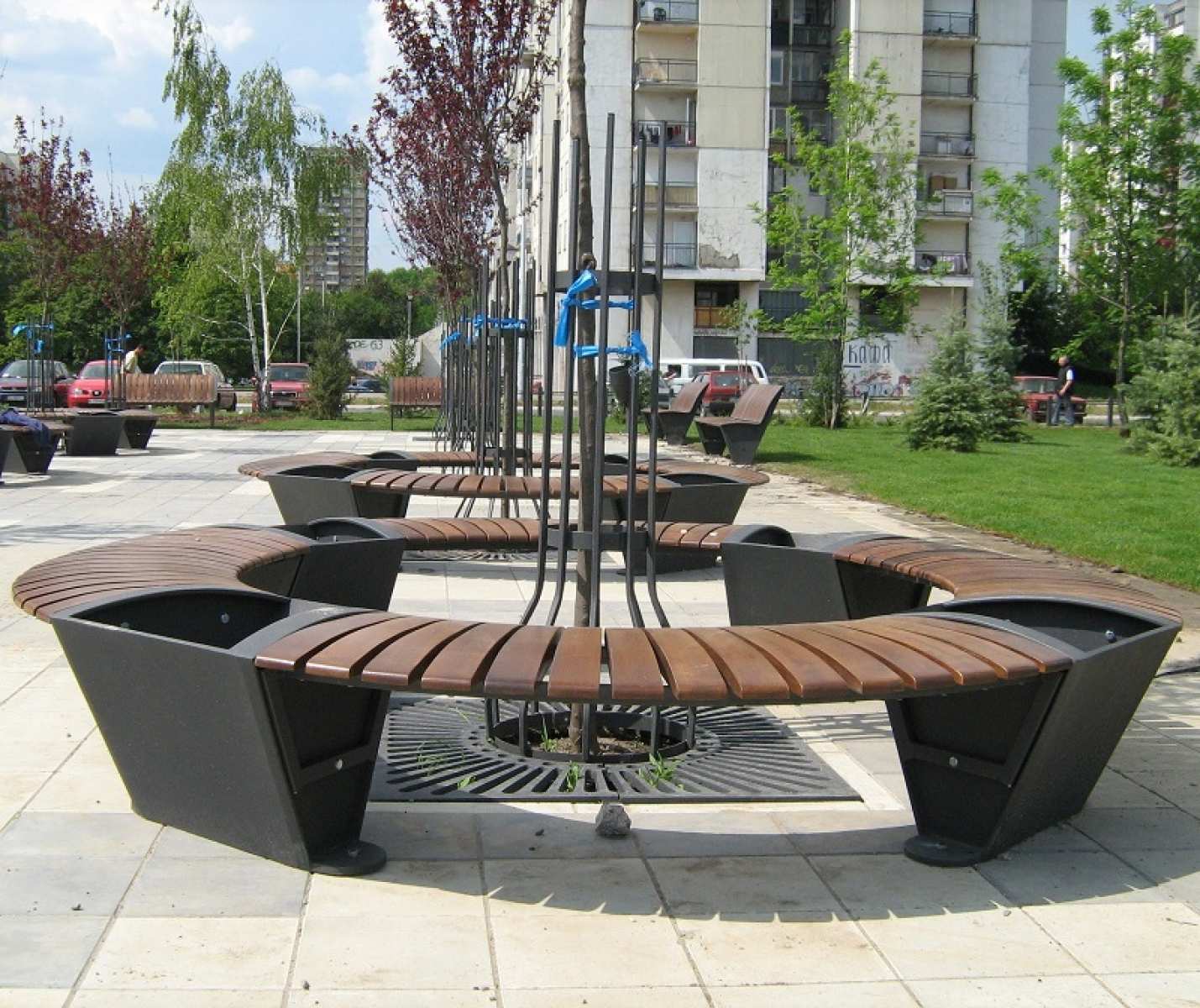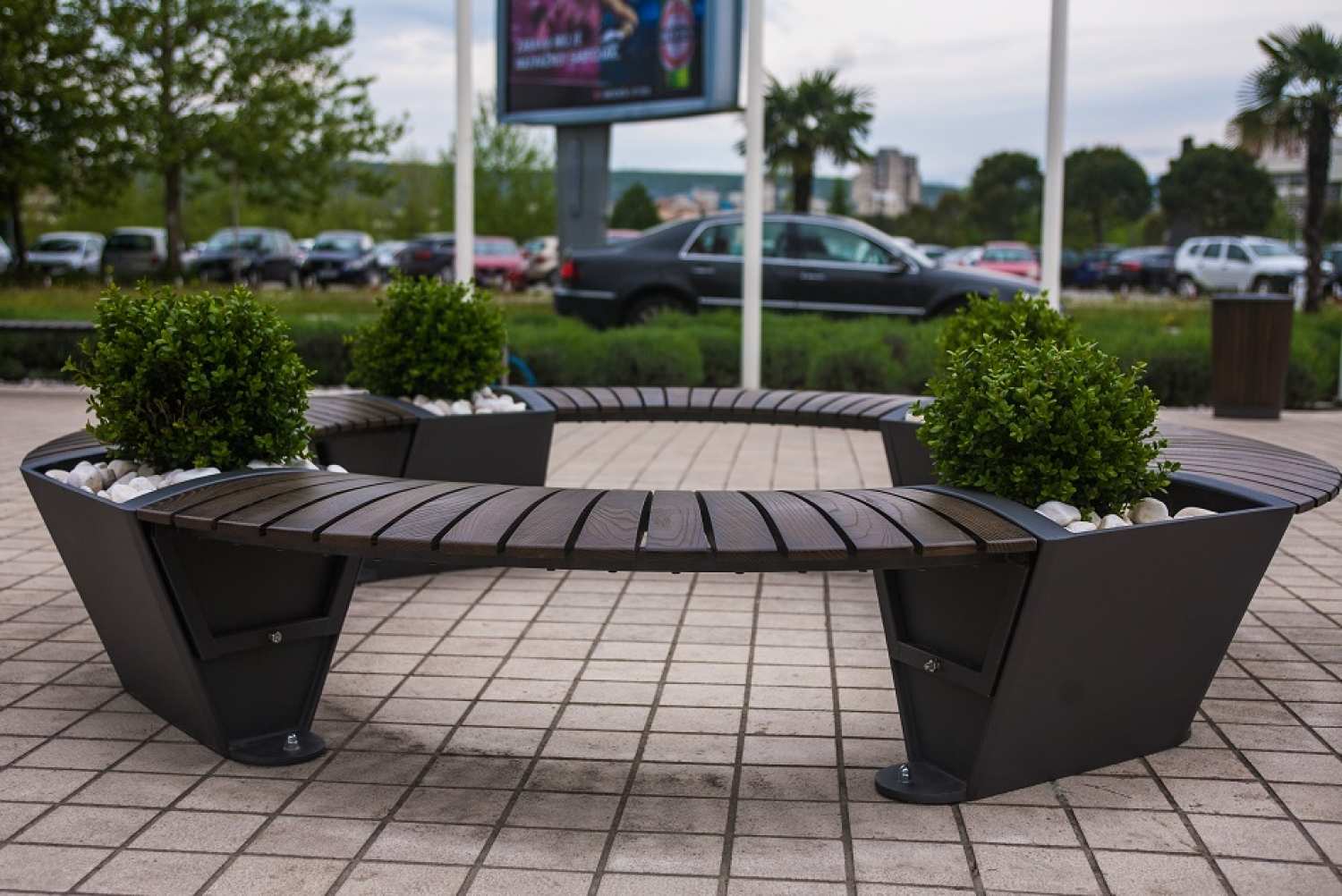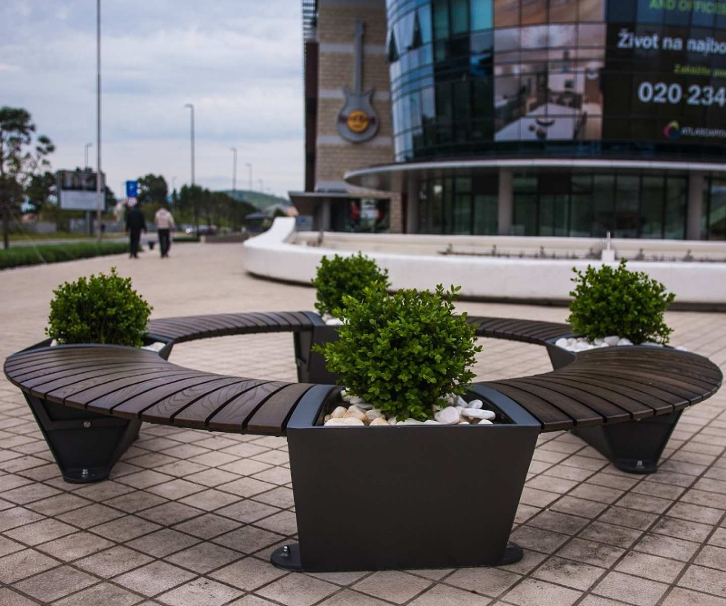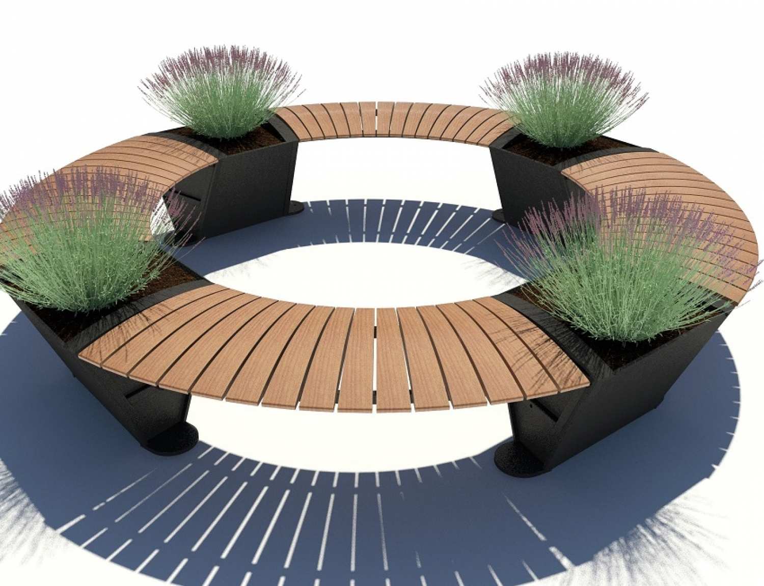 Ansamblu banca circulara din lemn exotic cu jardiniere metalice Pekada-011