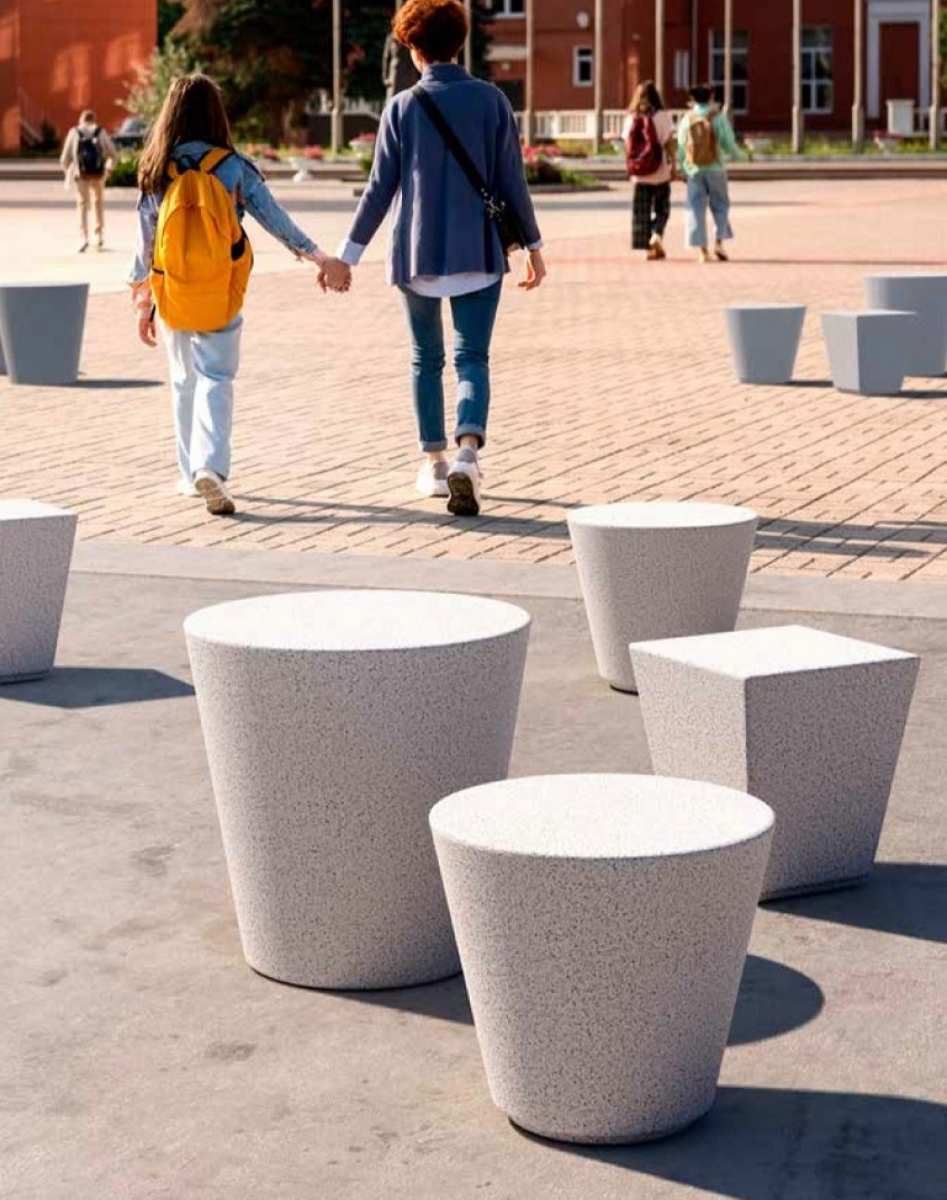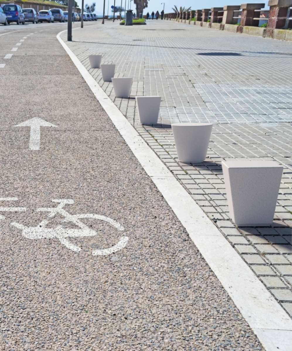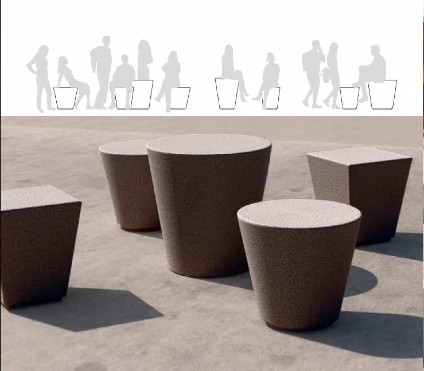 • beton arhitectural, cu agregate expuse din marmura colorata, zdrobita,  finisat hidrofugat (beton cu timbru verde, cu -35% emisii de CO2 fata de betonul obișnuit), cu rezistenta inalta la apa si radiatii UV.